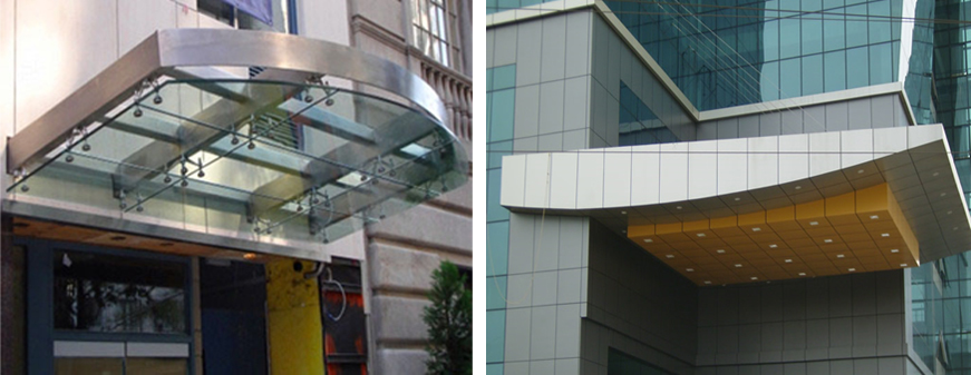 Most of our structure systems can be adapted or used as entrance canopies or porches. Not only can they serve as an architectural feature but they also give the practical benefits of providing protection from the weather whilst unlocking, queuing or waiting for access into the building. We manufacture metal (steel, stainless, aluminium) entrance canopies in Glass, polycarbonate and ACP Sheets.